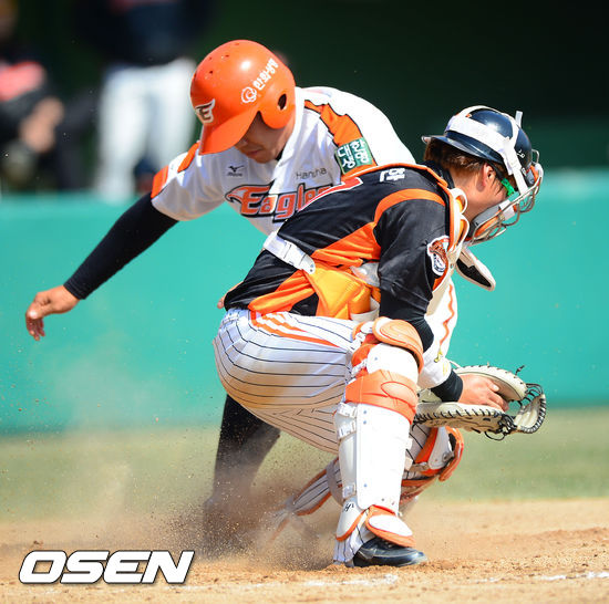 23일 오후 대전구장에서 열린 '2013 한국야쿠르트 세븐 프로야구' 한화 이글스와 롯데 자이언츠의 시범경기,3회초 2사 1루 한화 정현석의 외야 안타때 1루 주자 최진행이 롯데 용덕한 포수에게 포스아웃되고 있다