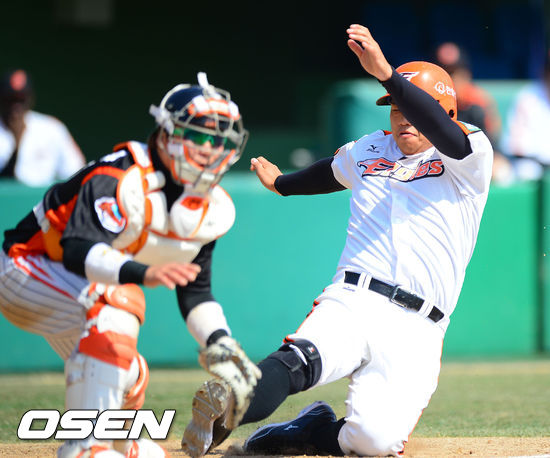 23일 오후 대전구장에서 열린 '2013 한국야쿠르트 세븐 프로야구' 한화 이글스와 롯데 자이언츠의 시범경기,3회초 2사 1루 한화 정현석의 외야 안타때 1루 주자 최진행이 롯데 용덕한 포수에게 포스아웃되고 있다