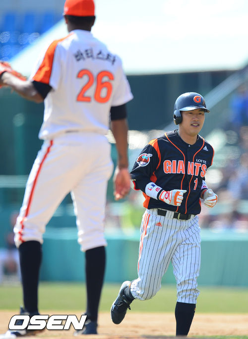 23일 오후 대전구장에서 열린 '2013 한국야쿠르트 세븐 프로야구' 한화 이글스와 롯데 자이언츠의 시범경기, 2회초 1사 롯데 장성호가 외야플라이 아웃된 후 더그아웃으로 들어가고 있다