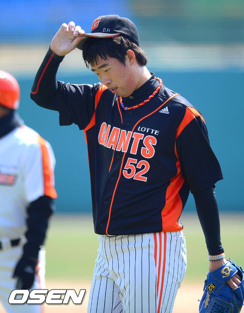 23일 오후 대전구장에서 열린 '2013 한국야쿠르트 세븐 프로야구' 한화 이글스와 롯데 자이언츠의 시범경기, 1회초 만루 위기를 넘긴 롯데 이재곤 선발투수가 이닝 종료 후 어두운 표정으로 더그아웃으로 들어가고 있다