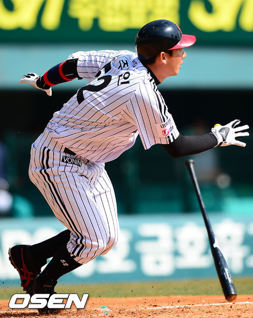 4회말 2사 주자 2,3루 LG 손주인이 선취 좌중간 2타점 3루타를 날리고 있다.