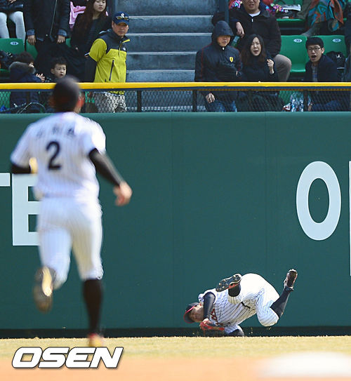 5회초 1사 두산 손시헌의 플라이타구를 LG 좌익수 정의윤이 몸을 날리며 잡아내고 있다.