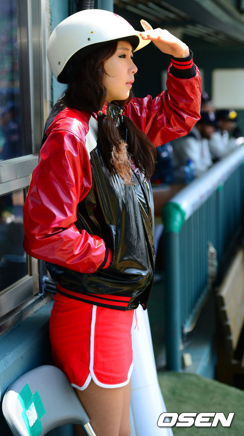 LG 배트걸 김민지가 손으로 햇빛을 가리며 경기를 주시하고 있다.