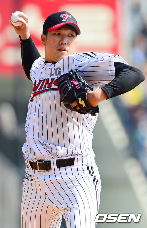 6회초 2사 주자 1루 LG 선발 리즈 대신 마운드에 오른 유원상이 1루에 견제구를 던지고 있다.