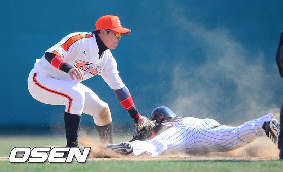 23일 오후 대전구장에서 열린 '2013 한국야쿠르트 세븐 프로야구' 한화 이글스와 롯데 자이언츠의 시범경기 6회초 1사 1루 롯데 강민호의 타석때 한화 이학준 2루수가 도루 시도한 1루 주자 손아섭을 태그아웃시키고 있다.