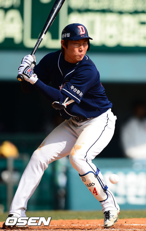 7회초 2사 두산 고영민이 타석에서 다리에 볼을 맞고 있다.