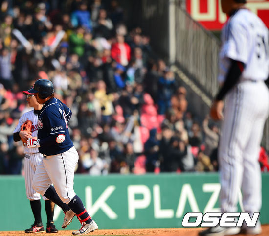 9회초 무사 주자 1루 두산 최준석이 중월 역전 투런 홈런을 날린 후 그라운드를 돌고 있다.
