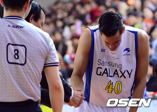 23일 오후 인천삼산월드체육관에서 열린 'KB 국민카드 2012-2013 프로농구' 6강 플레이오프 1차전 인천 전자랜드와 서울 삼성의 경기 1쿼터 삼성 이동준이 손가락 통증을 호소하고 있다.