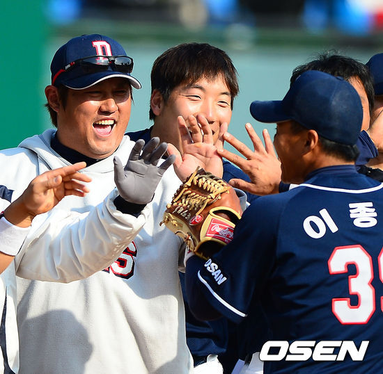 경기를 마치고 두산 최준석이 이종욱과 환하게 웃으며 하이파이브를 하고 있다. / rumi@osen.co.kr
