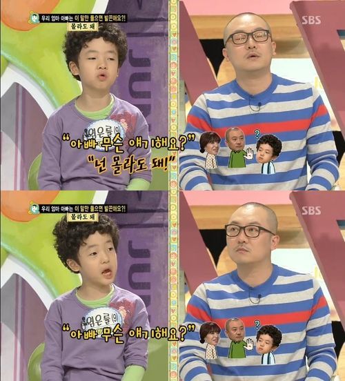 은률 군은 23일 방송된 SBS 예능프로그램 '스타주니어쇼 붕어빵'에서 "아빠에게 '몰라도 돼'라는 말을 했다가 혼이 났다. 나쁜말이 아닌 것 같은데 아빠가 화를 냈다"며 이에 대해 말했다.