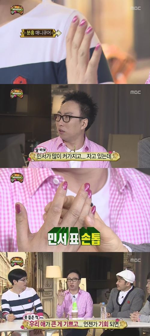 이날 오프닝에서 박명수는 갑자기 펄이 들어간 핑크색의 매니큐어를 바른 손가락을 공개했다. 멤버들이 궁금해 하자 박명수는 "민서가 많이 커서 내가 자는 동안 매니큐어를 칠했다"고 전했다.