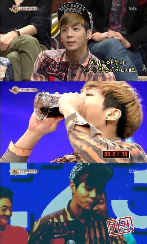 종현은 23일 방송된 SBS '놀라운 대회 스타킹'에서 5초만에 500ml 콜라 마시기에 도전, 결국 실패하고 말았다.