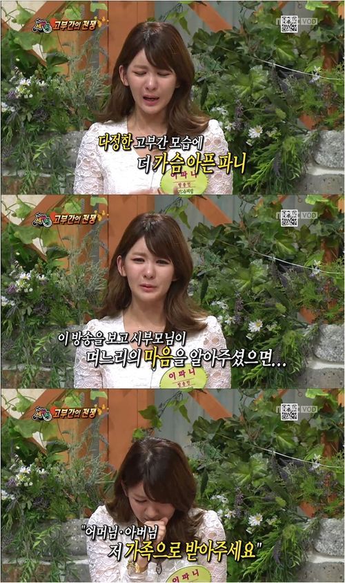 그는 “시부모님께 전화를 하면 안받아주신다”면서 “이 방송을 통해서 어머님과 아버님께 이렇게라도 마음을 전하고 싶다. 어머님, 아버님 날 가족으로 받아달라”고 진심을 표현했다. 이파니의 눈물 고백에 이날 박미선을 비롯한 여성 출연자들은 눈물을 하염 없이 쏟았다.