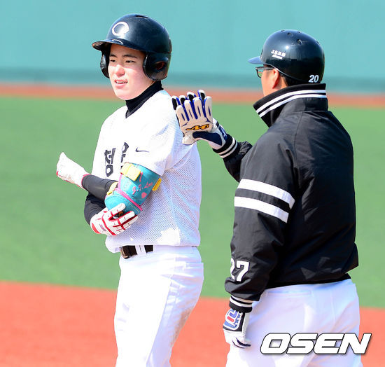 24일 오전 서울 구의구장에서 열린 '2013 고교야구 주말리그' 중앙고와 청원고의 경기 4회말 1사 만루 이정인이 1타점 적시타를 치고 1루에 서 있다.