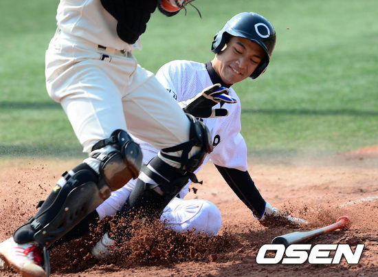 24일 오전 서울 구의구장에서 열린 '2013 고교야구 주말리그' 중앙고와 청원고의 경기 4회말 1사 만루 청원고 김지훈의 투수 앞 땅볼 상황, 3루주자 최재혁이 홈에서 아웃되고 있다.