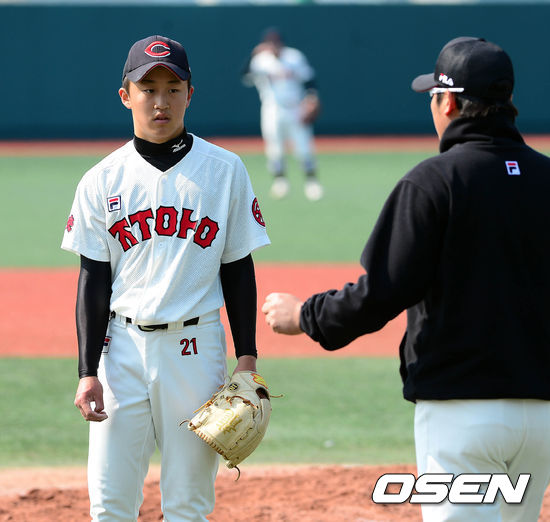 24일 오전 서울 구의구장에서 열린 '2013 고교야구 주말리그' 중앙고와 청원고의 경기 4회말 2사 만루 청원고 이상규-윤세찬에게 연속 밀어내기를 허용한 중앙고 권덕용이 마운드를 내려가고 있다.