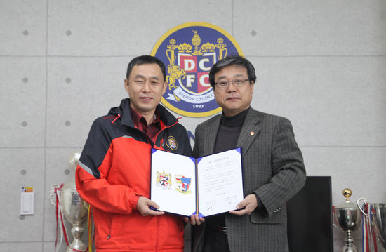 대전시티즌과 (사)태국임마누엘스포츠는 지난 22일 오전 11시 구단 사무국에서 강성민 태국 임마누엘스포츠 이사장과 전종구 대전시티즌 사장이 참석한 가운데 상호 교류 및 협력을 약속하는 업무협약식을 가졌다.