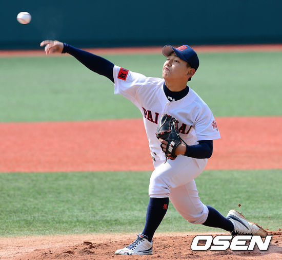 24일 오전 서울 구의구장에서 열린 '2013 고교야구 주말리그' 배재고와 휘문고의 경기 배재고 송범수가 역투하고 있다.