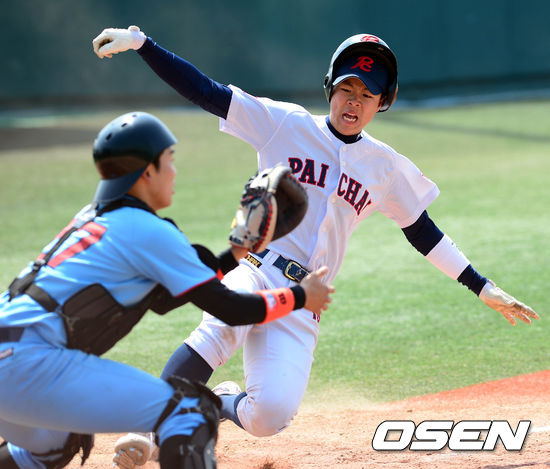 24일 오전 서울 구의구장에서 열린 '2013 고교야구 주말리그' 배재고와 휘문고의 경기 2회말 1사 1,3루 안형진의 내야땅볼 상황, 3루주자 강석주가 홈으로 쇄도하고 있다. 강석주는 홈에서 아웃.