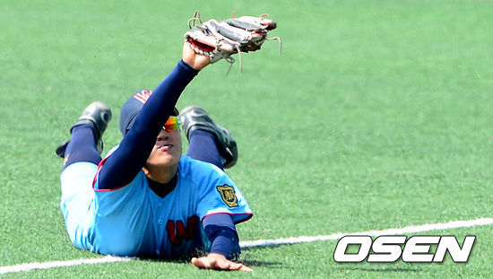 24일 오전 서울 구의구장에서 열린 '2013 고교야구 주말리그' 배재고와 휘문고의 경기 3회말 2사 1루 배재고 최종운의 뜬공을 휘문고 정종현이 잡고 있다.