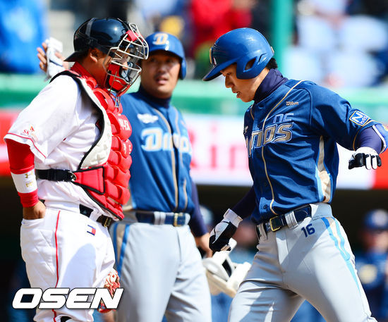 2회초 무사 주자 1루 NC 모창민이 좌중월 역전 투런 홈런을 날린 후 홈을 밟고 있다.