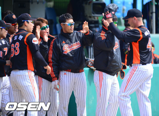 24일 오후 대전구장에서 열린 '2013 한국야쿠르트 세븐 프로야구' 한화 이글스와 롯데 자이언츠의 시범경기, 1회말 이닝 종료후 롯데 옥스프링 선발투수가 동료들의 축하를 받으며 더그아웃으로 들어가고 있다