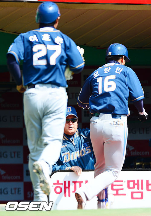 2회초 무사 주자 1루 NC 모창민이 좌중월 역전 투런 홈런을 날린 후 덕아웃에서 선행주자 이호준과 함께 NC 김경문 감독과 하이파이브를 하고 있다.