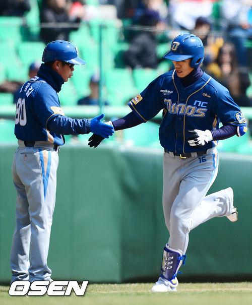 2회초 무사 주자 1루 NC 모창민이 좌중월 역전 투런 홈런을 날린 후 3루에서 이광길 코치와 하이파이브를 하고 있다.