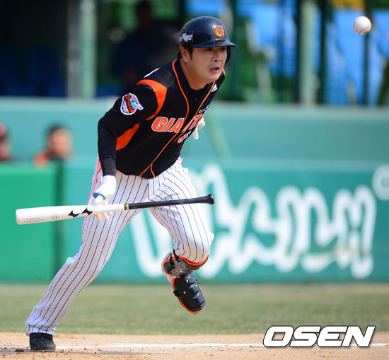 24일 오후 대전구장에서 열린 '2013 한국야쿠르트 세븐 프로야구' 한화 이글스와 롯데 자이언츠의 시범경기, 3회초 무사 1루 롯데 문규현이 기습번트 성공하고 있다