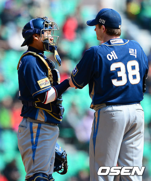 4회말 무사 주자 2루 SK 조성우에게 우익수 오른쪽 역전타를 맞은 NC 선발 에릭이 김태군과 얘기를 나누고 있다.