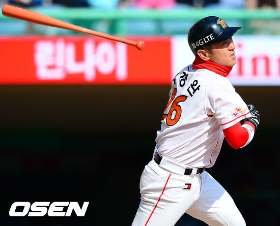 6회말 2사 주자 없는 상황에서 SK 박경완이 우중간 1루타를 날리고 있다.
