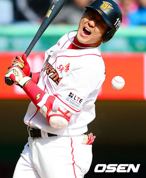 7회말 2사 주자 2루 SK 최정이 타석에서 몸에 NC 황덕균의 볼을 맞고 있다.