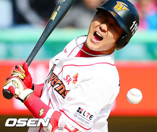 7회말 2사 주자 2루 SK 최정이 타석에서 몸에 NC 황덕균의 볼을 맞고 있다.