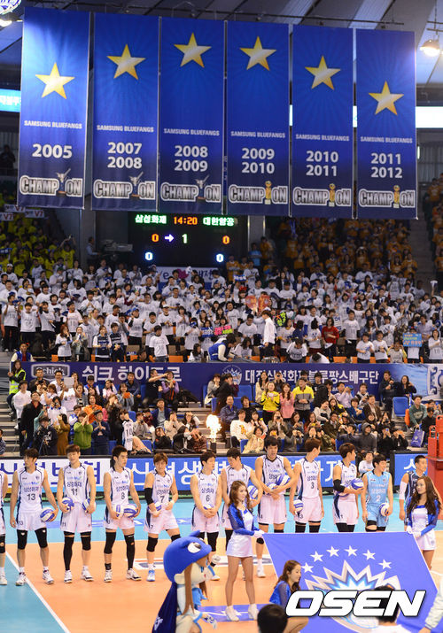 24일 오후 대전 충무체육관서 열린 NH농협 2012~2013 V-리그 남자부 챔피언결정전 1차전 경기, 경기에 앞서 삼성화재 선수들이 소개되고 있다