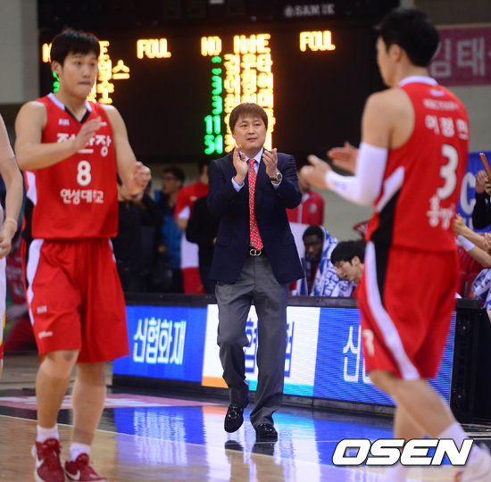 24일 오후 안양 실내체육관에서 열린 '2012-2013 KB국민카드 프로농구' 6강 플레이오프 2차전 안양 KGC인삼공사와 고양 오리온스의 경기 1쿼터 인삼공사 이상범 감독이 선수들에게 박수를 보내고 있다.