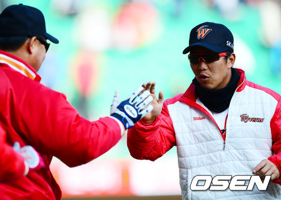 경기를 마치고 SK 정근우가 이만수 감독과 하이파이브를 하고 있다. / rumi@osen.co.kr