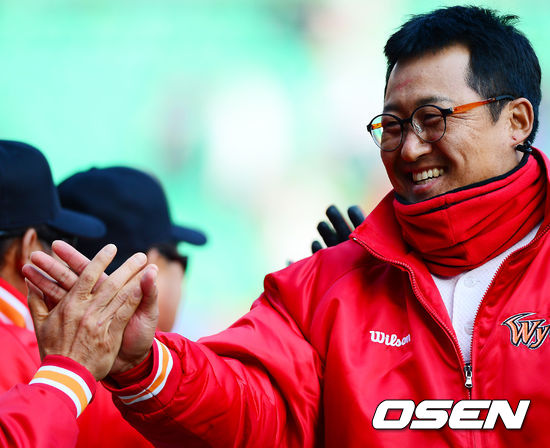 경기를 마치고 SK 조인성이 코치진들과 환하게 웃으며 하이파이브를 하고 있다. / rumi@osen.co.kr