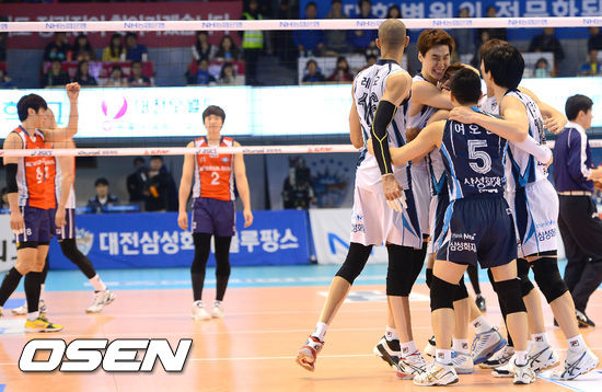 삼성화재 블루팡스가 24일 대전 충무체육관에서 열린 NH농협 2012-2013시즌 V리그 남자부 챔피언결정전 1차전 대한항공 점보스와 경기서 세트스코어 3-1(23-25, 25-20, 25-18, 25-22)로 승리를 거뒀다. 이날 승리로 삼성화재는 6년 연속 챔피언결정전 우승을 향해 첫 걸음을 내딛었다.