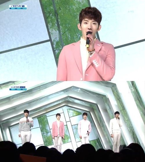 이날 조권은 분홍색의 재킷을 입고 애절한 발라드 '어느 봄날'로 감미로운 음색을 뽐냈다.