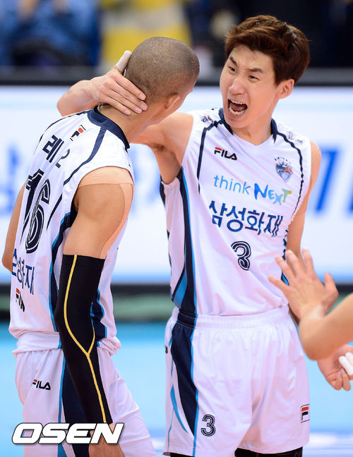4세트 삼성화재 레오의 공격 성공 후 박철우가 레오를 격려하고 있다 /soul1014@osen.co.kr