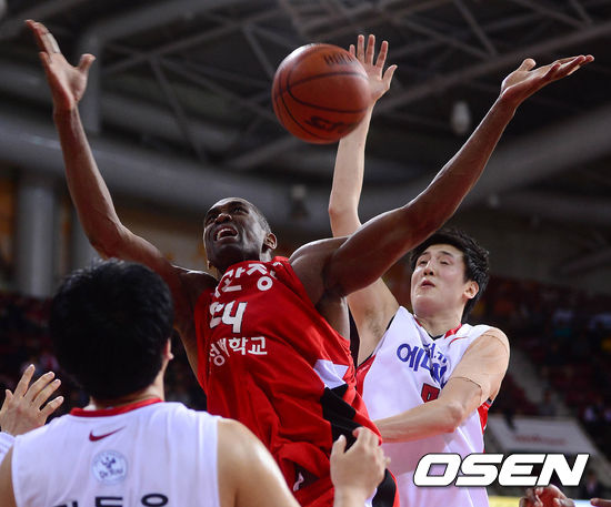 24일 오후 안양 실내체육관에서 열린 '2012-2013 KB국민카드 프로농구' 6강 플레이오프 2차전 안양 KGC인삼공사와 고양 오리온스의 경기 2쿼터 키브웨와 최진수가 리바운드 다툼을 하고 있다.