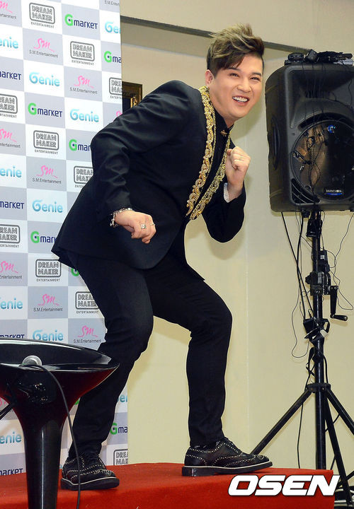24일 오후 서울 올림픽공원 체조경기장에서 열린 슈퍼주니어 월드 투어 '슈퍼쇼5' 기자회견에서 신동이 장난을 치고 있다.