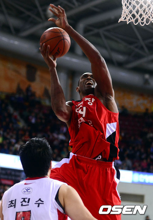 24일 오후 안양 실내체육관에서 열린 '2012-2013 KB국민카드 프로농구' 6강 플레이오프 2차전 안양 KGC인삼공사와 고양 오리온스의 경기 2쿼터 키브웨가 골밑슛을 시도하고 있다.