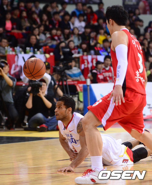 24일 오후 안양 실내체육관에서 열린 '2012-2013 KB국민카드 프로농구' 6강 플레이오프 2차전 안양 KGC인삼공사와 고양 오리온스의 경기 4쿼터 전태풍이 드리블 중 넘어지면서 공을 놓치고 있다.