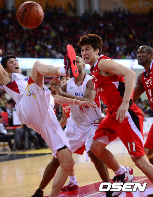 24일 오후 안양 실내체육관에서 열린 '2012-2013 KB국민카드 프로농구' 6강 플레이오프 2차전 안양 KGC인삼공사와 고양 오리온스의 경기 4쿼터 최진수(왼쪽)가 양희종과 리바운드 다툼 중 넘어지고 있다.