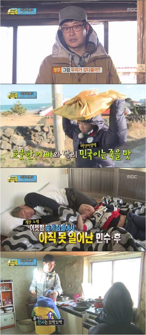 김성주와 김민국은 24일 방송된 MBC 예능 프로그램 ‘일밤-아빠 어디가’에서 늦잠을 자는 바람에 네 번째로 아침 식사 재료를 획득했다. 하지만 이들보다 더 늦은 가족이 있었으니 윤민수와 윤후 부자였다.