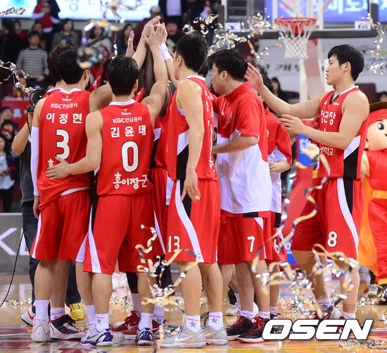 24일 오후 안양 실내체육관에서 열린 '2012-2013 KB국민카드 프로농구' 6강 플레이오프 2차전 안양 KGC인삼공사와 고양 오리온스의 경기 종료 후 인삼공사 선수들이 하이파이브를 하고 있다.