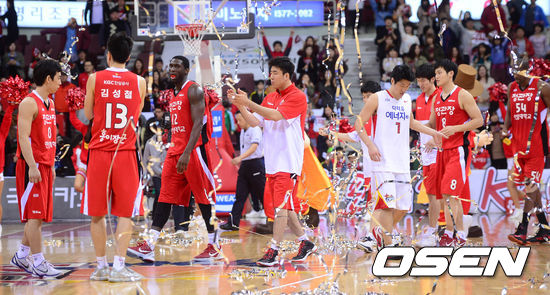 24일 오후 안양 실내체육관에서 열린 '2012-2013 KB국민카드 프로농구' 6강 플레이오프 2차전 안양 KGC인삼공사와 고양 오리온스의 경기 종료 후 인삼공사 선수들이 하이파이브를 하고 있다.