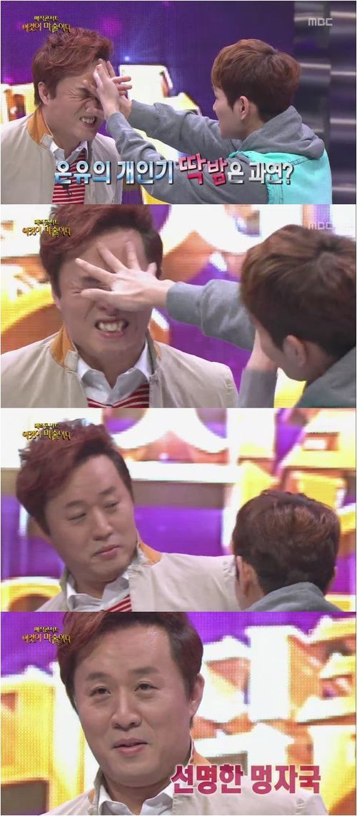 방송인 정준하가 온유의 딱밤에 선명한 멍자국을 남기며 맞는 방송의 1인자의 면모를 과시했다.