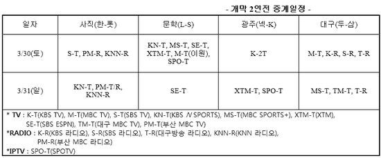 페넌트레이스 개막전 최초로 사직(한화-롯데), 광주(넥센-KIA), 대구(두산-삼성) 3개 구장에 각각 SBS와 KBS, MBC 등 지상파 방송 3개사가 동시에 중계에 들어간다. 문학 경기(LG-SK)는 MBC의 이원중계와 함께 케이블 방송 4개사가 함께 중계한다.
